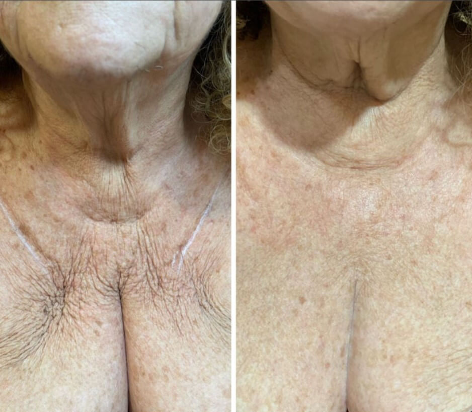 Se trabaja toda la zona de escote, se realiza una valoración integral de la zona para determinar el tratamiento ideal para cada paciente, ya se enfocarse más en manchas, flacidez, deshidratación de la piel, arrugas entre otras. Se pueden complementar distintos tratamientos para mejorar múltiples cuestiones.
